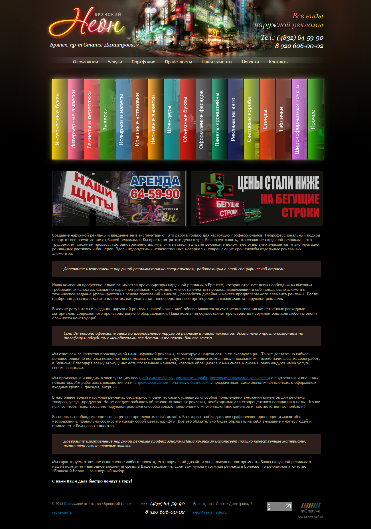 «Брянский Неон» — рекламное агентство, специализирующееся на изготовлении наружной и внутренней рекламы, разработке эскизов и товарных знаков, а также полноцветной широкоформатной печати и других рекламных решениях.
