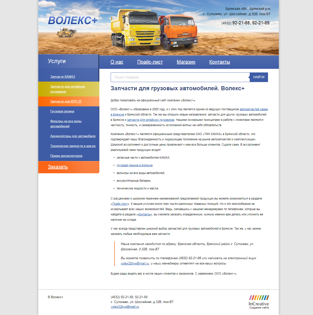ООО «Волекс+» было основано в 2005 году и с тех пор успешно работает на рынке автозапчастей в Брянске и Брянской области. Компания является одним из ведущих поставщиков запчастей для автомобилей КАМАЗ, а также расширила ассортимент комплектующими для других грузовых автомобилей, включая технику китайского производства.